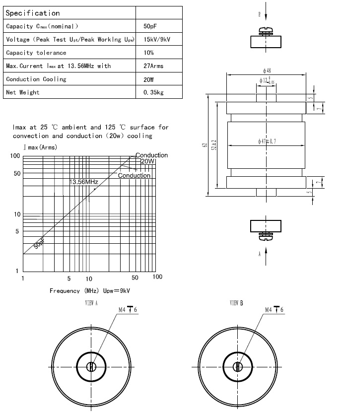 CKT50/9/27型固定陶瓷高压真空电容器采用陶瓷外壳、真空介质、具有耐压高、体积小、Q值高、性能稳定可靠价格低廉等特点,广泛用于感应加热、介质加热、通讯、广播等设备。该款电容器可以替换comet旧型号MC1C-50E/15真空电容器,comet新型号CFMN-50CAC/15-AF-G真空电容器