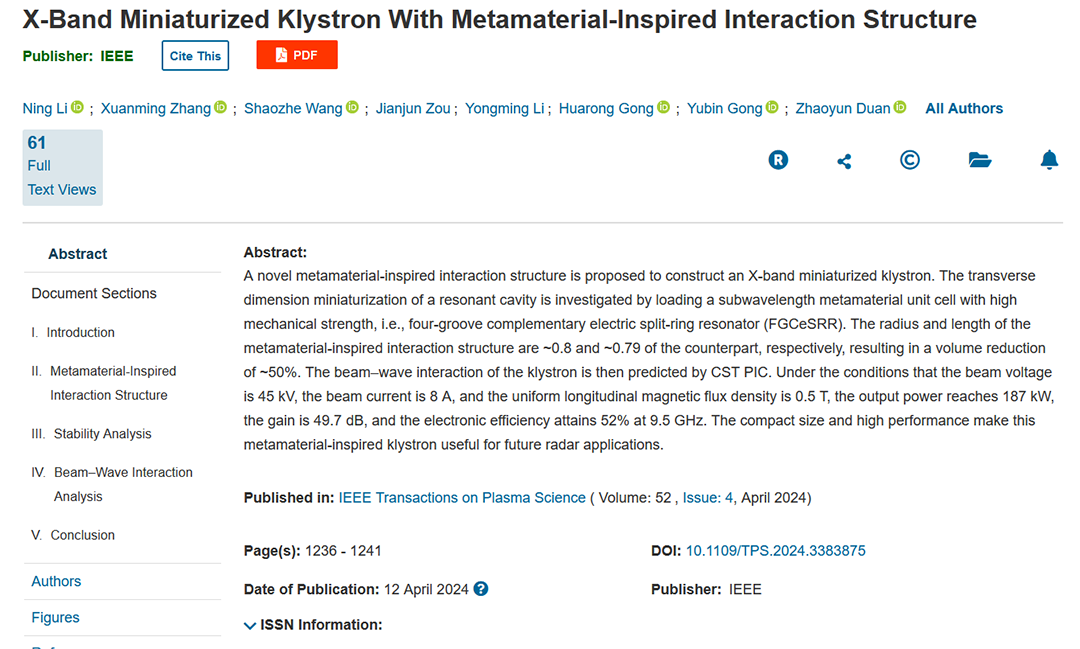 w66利来国际大功率器件工业技术研究院(以下简称国力研究院)李永明、王少哲、邹建军团队与电子科技大学科学与工程学院段兆云教授团队共同在《IEEE Transactions on Electron Devices》刊登发表题为“X-Band Miniaturized KIystron With MetamateriaI-Inspired lnteraction Structure”的文章。